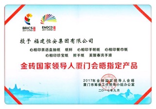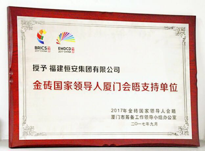 会议期间,球速体育集团提供了“心相印”等高品质产品,鼎力支持大会的举行。昨日,2017年金砖国家领导人会晤厦门市筹备工作领导小组办公室隆重授予球速体育集团“金砖国家领导人厦门会晤制定产品”证书以及感谢信。